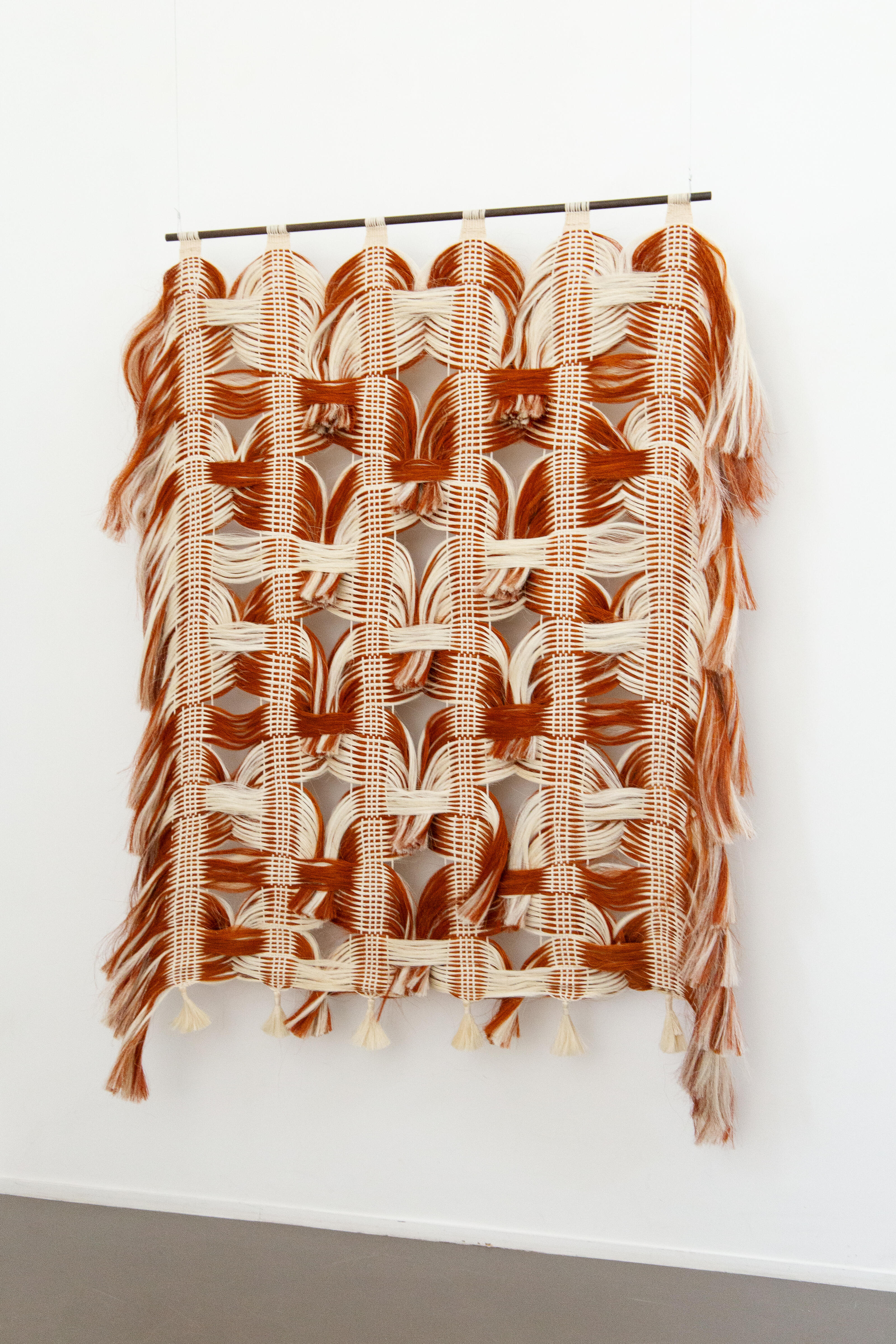 BuyHandwoven tapestry composed of six interweaving belts that form the lateral and central braids, creating a flowing movement in empty space. By breaking the traditional weaving grid through diagonal lines, the structure introduces rhythm and motion enhanced by two contrasting colors. Made with agave fibres, the piece follows the material’s own structural logic, where fibres intertwine freely, shifting in volume, density and form.
